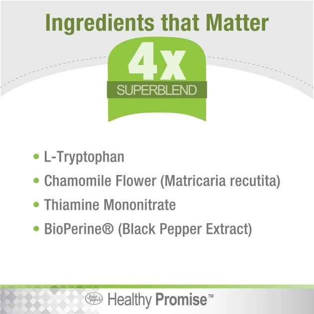 L-Tryptophan, Chamomile Flower (Matricaria recutita), Thiamine Mononitrate, BioPerine (Black Pepper Extract), Brewers Dried Yeast, Calcium Propionate (preservative), Canola Oil, Citric Acid, Corn Starch, Disodium Phosphate, Dried Cheese, Dried Chicken Liver, Green Tea Extract, Mixed Tocopherols (preservative), Natural Flavors, Rosemary Extract, Salmon Oil, Silicon Dioxide, Sorbic Acid (preservative), Soy Lecithin, Vegetable Glycerin, Vegetable Oil, Water.