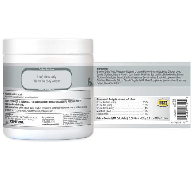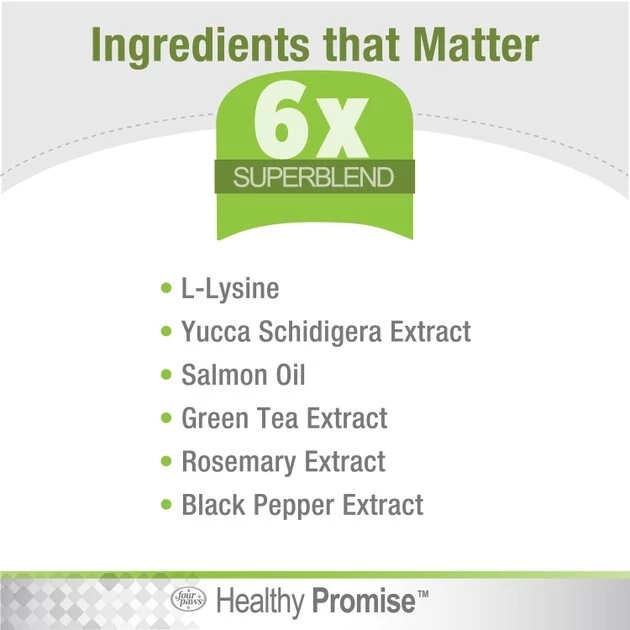 Your favorite feline can breathe easier with Four Paws Healthy Promise Immune Support with L-Lysine Chews Supplement for Cats. These soft chews are specially formulated with key amino acids that help support your pretty kitty’s respiratory health. They’re rich in a 6x super-blend of lysine, yucca schidigera extract, salmon oil and rosemary extract—ingredients designed to help reduce symptoms like sneezing, panting and lethargy. They also feature a totally tasty chicken flavor so your paw-tner can enjoy a tasty treat while getting a helping of healthy benefits. And as a bonus, these health-boosting chews feature the National Animal Supplement Council’s (NASC) seal of approval and are made in the USA—a supplement both you and your kitty can feel good about!