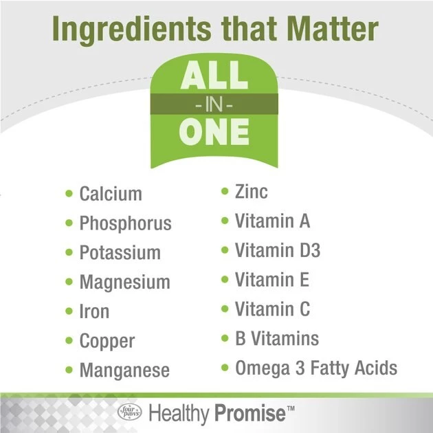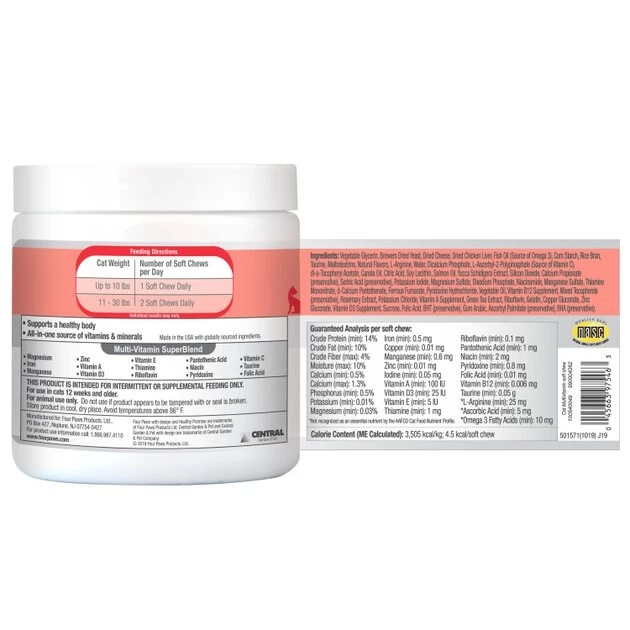 Help your favorite furry paw-tner stay at the top of her game with Four Paws Healthy Promise Multi-Vitamin All-In-One Chicken Flavor Soft Chews Cat Supplement. This all-in-one chew is loaded with essential vitamins and minerals to help your cat stay active and well. A blend of magnesium, iron, zinc and vitamin C all work to support your kitty’s immune system and overall health, while the tasty chicken flavor makes this supplement easy to enjoy. These quality supplements are also made in the USA and feature the National Animal Supplement Council’s (NASC) seal of approval. It’s just the boost your precious pal needs for a healthy and happy lifestyle!
