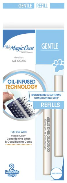 Help your dog achieve a glossy, moisture-rich coat with Four Paws’ Magic Coat Gentle Dog Moisturizer Conditioning Strip Refills! The two included strips are compatible with Four Paws’ Magic Coat Conditioning Brush or Conditioning Dog Comb (sold separately) and are infused with calming essential oils like mineral, almond, jojoba, coconut, olive and flaxseed oil to help moisturize your canine’s coat. Just insert the Herbal Control Conditioning Strip in the center plastic portion of the brush and groom your pet! Not only are these strips reusable and suitable for all coat types, but they are also residue-free and unscented, so they won’t make a mess or bother your dog’s nose or your nose!