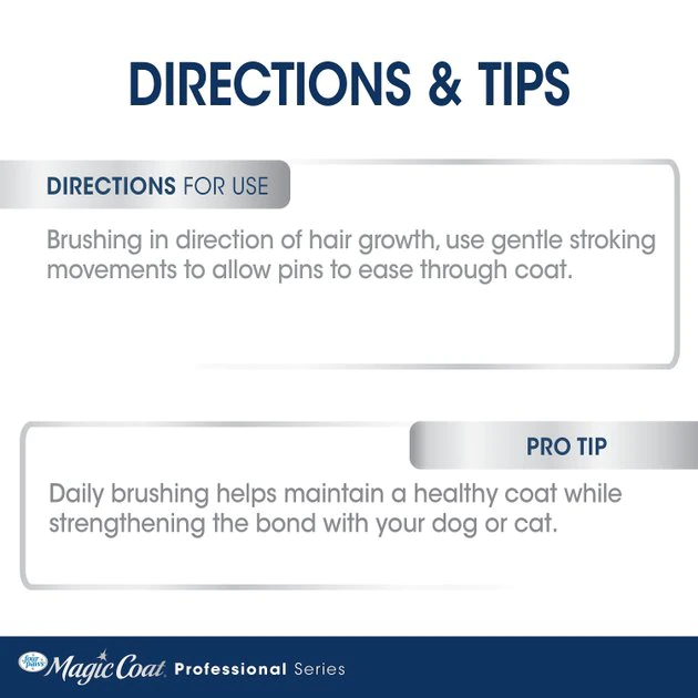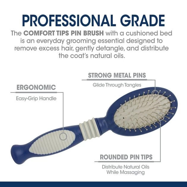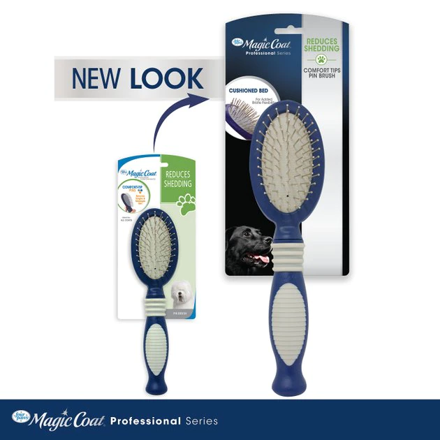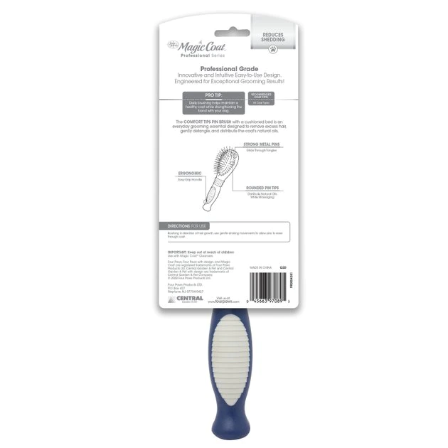 Four Paws Magic Coat Pin Brush has comfort tips! For a well groomed appearance, dogs need to be combed and brushed regularly. The Magic Coat Pin Brush features an ergonomic comfort handle and metal pins used to help reduce knots and tangles leaving a shiny, healthy coat.