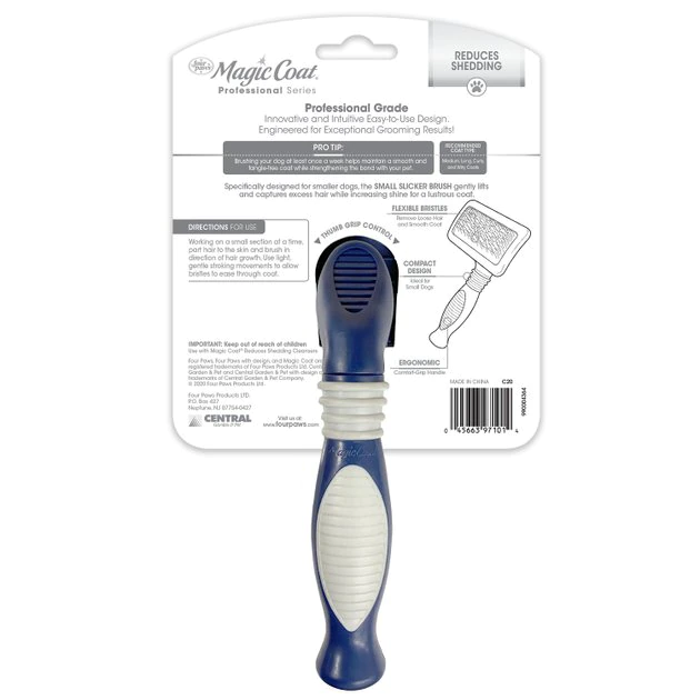 Four Paws Magic Coat Professional Series Slicker Dog Brush is the paw-fect grooming tool for smaller dogs. It’s designed with fine wire bristles that lift and capture excess hair and it even helps impart shine for a lustrous finish. The durable ergonomic handle and thumb grip delivers comfort and control. Best of all, it works great on small dogs with medium, long, curly or wiry coats!