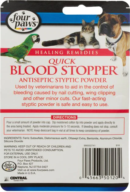 Uh-oh! Like their two-legged counterparts, four-foot friends can get an occasional boo-boo, too. Four Paws Quick Blood Stopper Powder helps stop bleeding from minor cuts and scrapes from trimming nails, wing clipping and docking. The styptic powder has been used by veterinarians and breeders for dogs, cats and feathered friends for years and now you can use it in the comfort of your own home!