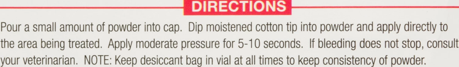Pour a small amount of powder into cap. Dip moistened cotton tip into powder and apply directly to the area being treated. Apply moderate pressure for 5 – 10 seconds. If bleeding does not stop, consult your veterinarian.