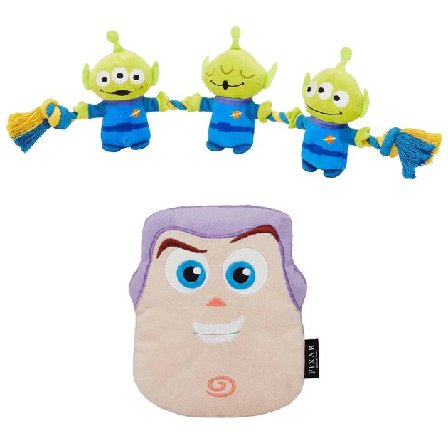 - Each purchase comes with The Pixar Aliens Plush with Rope Squeaky Dog Toy & The Pixar Buzz Lightyear Round Plush Squeaky Dog Toy.