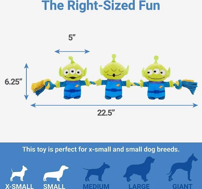 - The Pixar Aliens Plush with Rope Squeaky Dog Toy features a cotton/poly rope with 3 Toy Story Pizza Planet aliens attached for out-of-this-world fun.