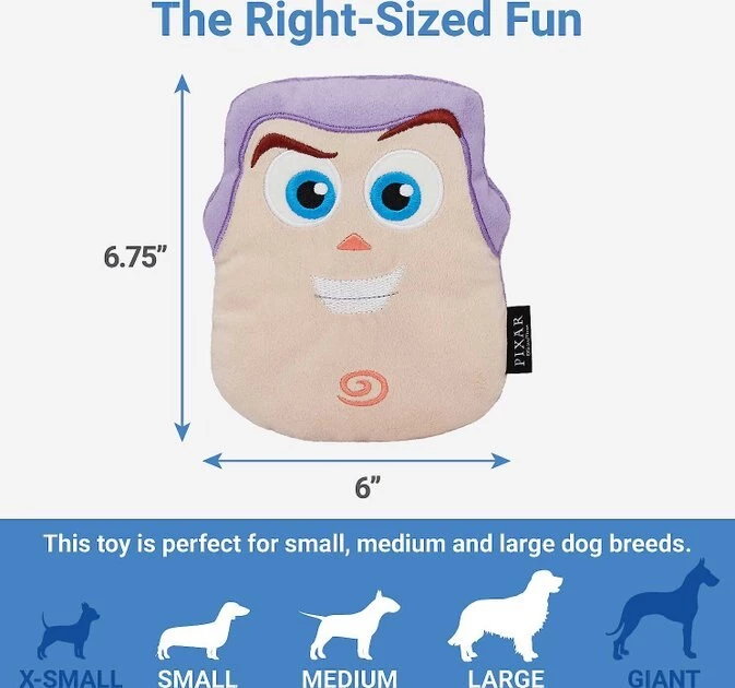 - The Pixar Buzz Lightyear Round Plush Squeaky Dog Toy features a squeaker and crinkle paper for lots of loud excitement.