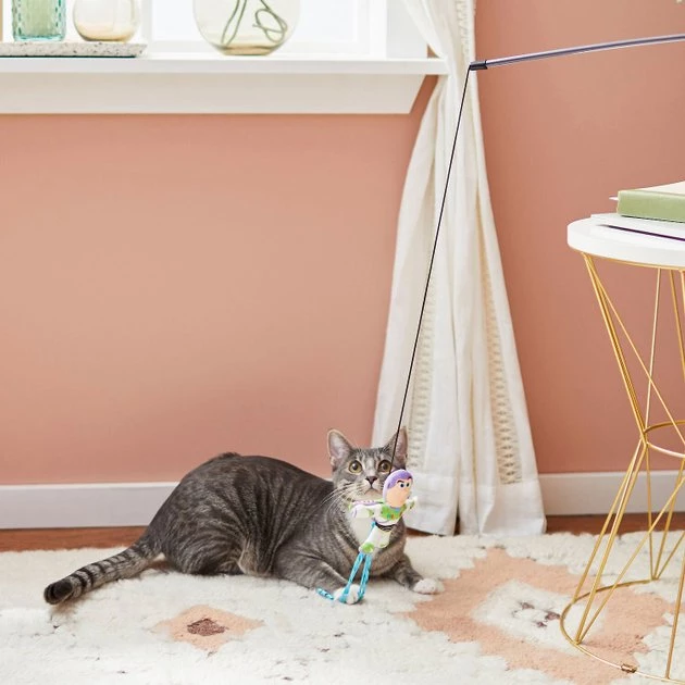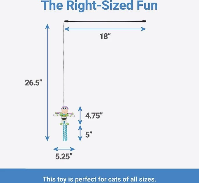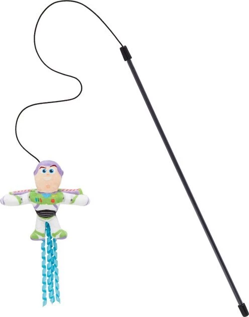 - Teaser-style toy features a wand with a catnip- and crinkle paper-stuffed Buzz Lightyear toy plus enticing ribbons attached—purr-fect for active cats who love to chase, pounce and play.