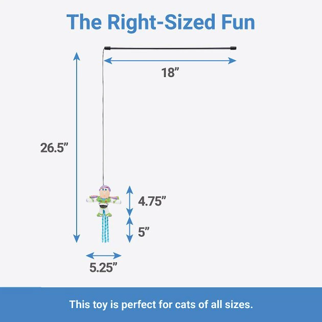 Take this teaser toy to your furry leader! Once your feline overlord learns what fun they can have with Buzz Lightyear of Star Command, the stalking, pouncing and chasing just won’t stop. This teaser toy, available only at Chewy, is a great bonding tool for you and your cat. The wand style puts you in control of your pet’s play and the Buzz plush—with a claw-friendly cover and catnip and crinkle paper stuffed inside—entices them to keep after it until they can finally sink their claws in. With a flick of your wrist, you can send any kitty, big or small, blasting off into a whole new universe of fun. Exercise your little hunter’s instincts for prey AND play with a little help from Buzz.