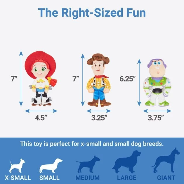 My dog absolutely loves these toys! The squeakers are loud and engaging, and the plush material is soft and safe. The Buzz Lightyear, Woody, and Jessie designs are perfect for any Toy Story fan. They’ve held up well so far, and I’d definitely buy them again.