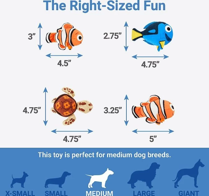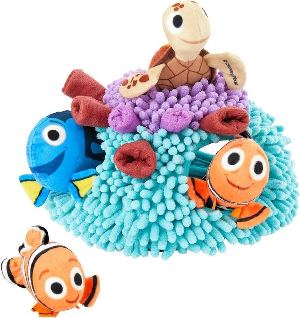 - Plush puzzle toy includes an anemone base and Nemo, Marlin, Dory and Crush plushies for your pup to pull out.
