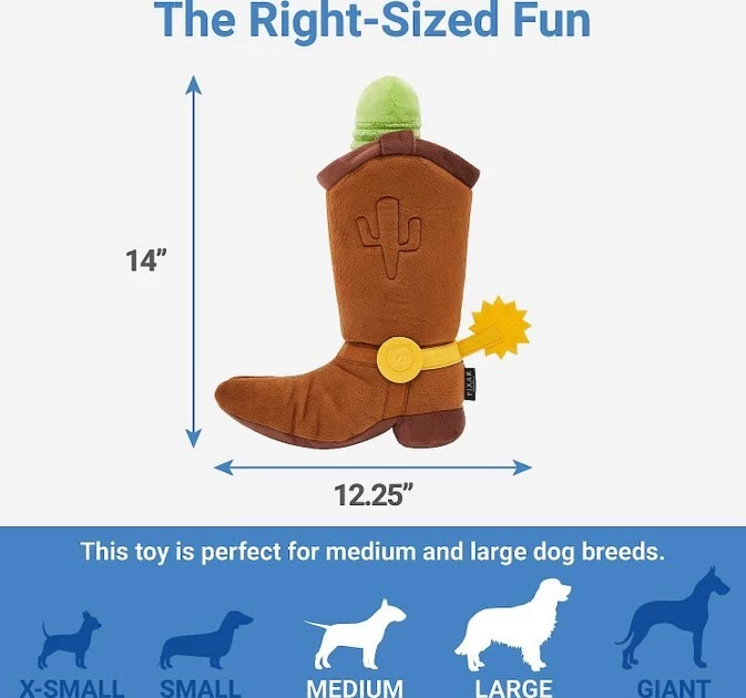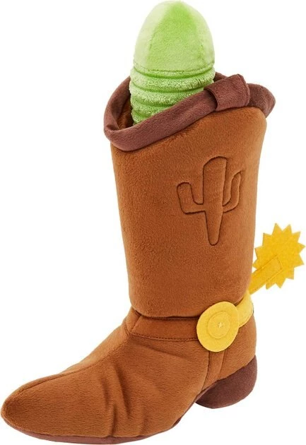 - The Pixar Woody’s Boot Plush Squeaky Dog Toy features a soft corduroy cover that creates a unique texture, and lots of plush stuffing inside.