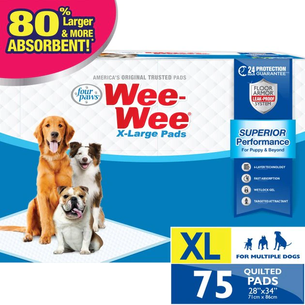 Wee-Wee Extra Large Puppy Pee Pads are 80% larger and more absorbent than your average dog training pads. These heavy-duty pads have a 6-Ply Leak-Proof Floor Armor System, trap in wetness with a quilted top layer and feature two moisture-locking layers for maximum absorption. These pee pads also have a leak-proof backing to keep your floors nice and dry! All Wee-Wee dog pee pads also include a targeted attractant to draw your paw-tner to the pad and prevent potty training accidents elsewhere. Each Wee-Wee Extra Large Puppy Pee Pads measures 28 inches x 34 inches and is paw-fect for furry friends of all sizes and homes with multiple canine companions!